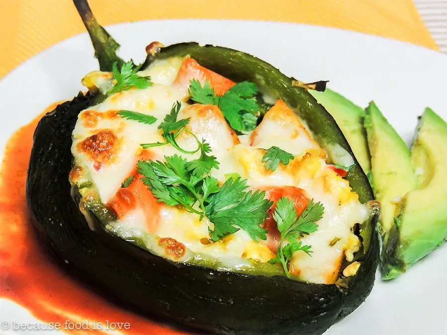Chili Relleno Stuffed with White Beans, Corn, and Spinach with Enchilada Sauce