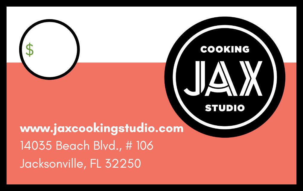 Gift certificates may either be purchased online or in JAX Cooking Studio. If you purchase an electronic gift certificate, email it to yourself for printing at home OR email it directly to your recipient on your preferred date. Plastic gift cards are available for purchase in JAX Cooking Studio.