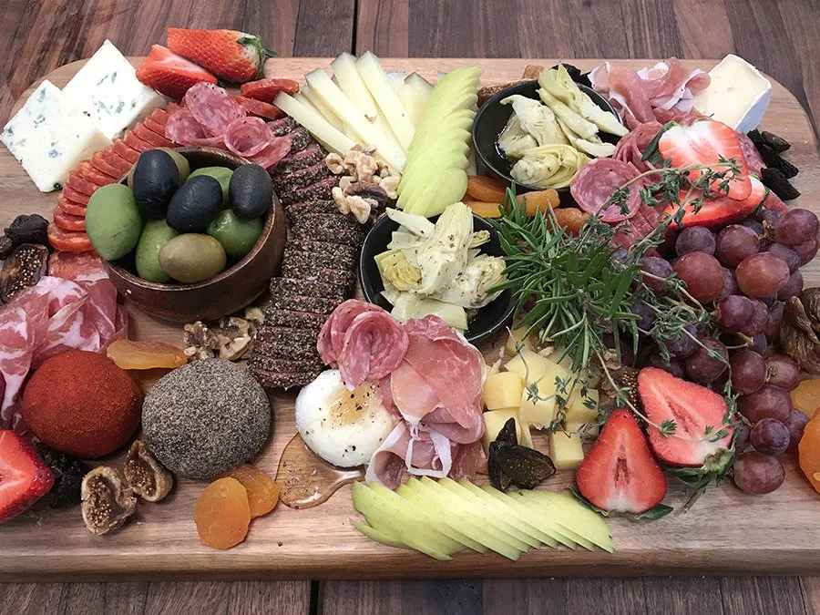 Our grazing boards are beautiful and delicious! They serve four to five people and contain an assortment of meats, cheeses, dried and fresh fruits, jams, pickles, crudite, nuts, crackers and crostini.
